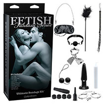 Black Bondage Kit - 5 Piece Set Turn your bedroom into an erotic playground with the First Time Fantasy Kit. This kinky collection is perfect for bondage beginners and offers something exciting for everyone. Break the ice with a flirty game of erotic dice, then blindfold your lover and begin to take advantage of your subject.