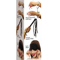 FETISH FANTASY SERIES LOVER'S FANTASY KIT : Pipedream Bondage Kit - 3 Piece Set Explore each other's naughty side with this Lover's Fantasy Kit. Kit includes a leather whip, metal handcuffs with keys, and a free satin love mask.